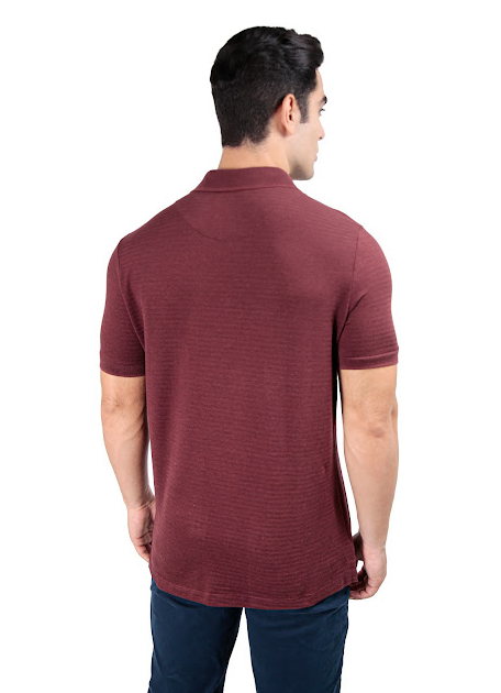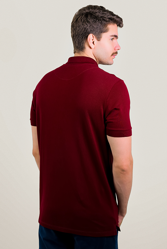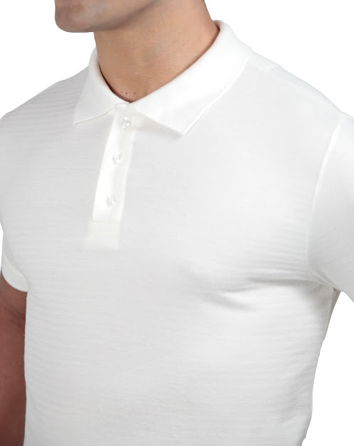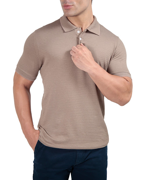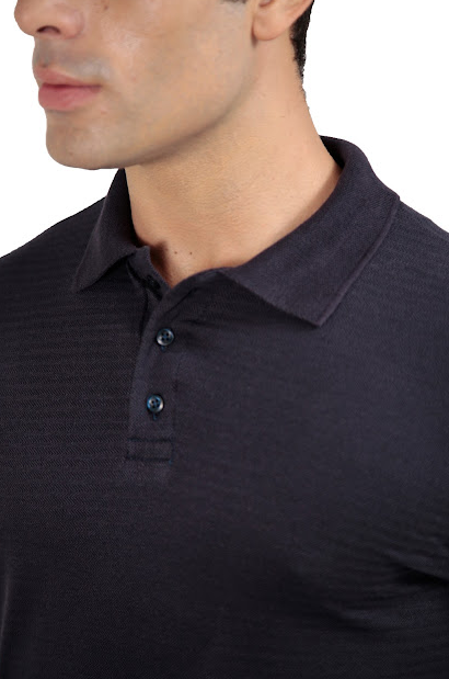 A polo maquinetada tem padronagem com pontos sutis e elegância em sua combinação de fios.